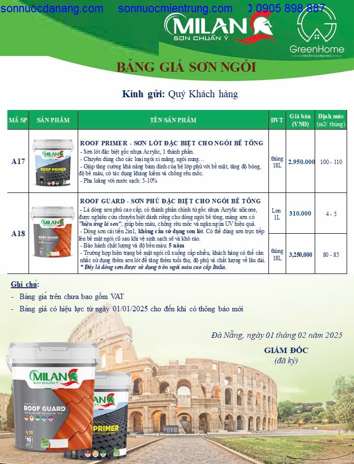 Đơn giá sơn phủ cho ngói: 310.000đ/01lit; 3.250.000đ/thùng18lit