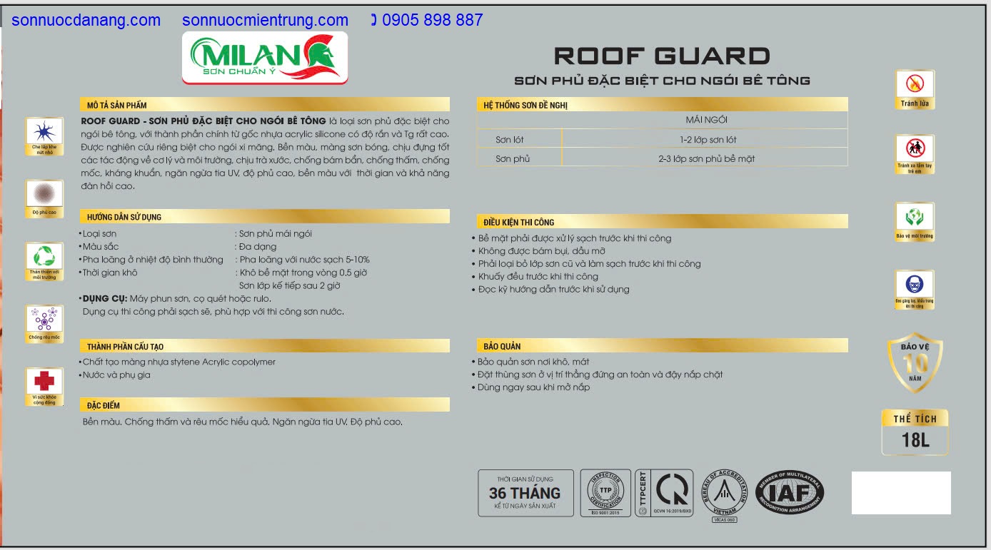 Sơn ngói cao cấp MILAN ITALIA tại Đà Nẵng Hà Nội Hồ Chí Minh và Toàn quốc là một loại sơn gốc nước được sản xuất 100% gốc nhựa Acrylic, màn sơn bóng, chống nấm mốc và kháng kiềm, khả năng chống thấm gấp 2 lần tuyệt đối, độ bền màu cao, chống bám bụi và chịu được những tác động trong điều kiện thời tiết khắc nghiệt, chống rạn nứt. Sản phẩm được phát triển và sản xuất bởi hệ thống tự động khép kín phù hợp theo tiêu chuẩn công nghệ ITALIA (Ý). Sơn có 6 màu thông dụng nhất hiện nay.