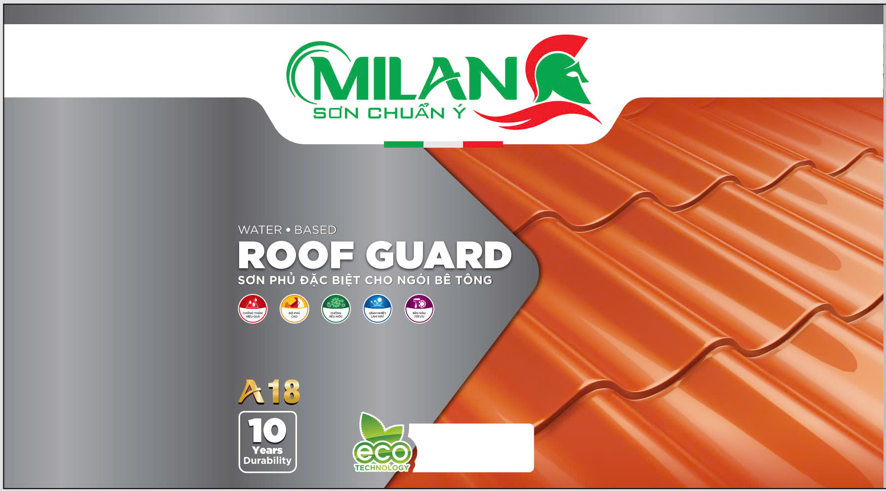 Sơn ngói cao cấp MILAN ITALIA là một loại sơn gốc nước được sản xuất 100% gốc nhựa Acrylic, màn sơn bóng, chống nấm mốc và kháng kiềm, khả năng chống thấm gấp 2 lần tuyệt đối, độ bền màu cao, chống bám bụi và chịu được những tác động trong điều kiện thời tiết khắc nghiệt, chống rạn nứt. Sản phẩm được phát triển và sản xuất bởi hệ thống tự động khép kín phù hợp theo tiêu chuẩn công nghệ ITALIA (Ý). Sơn có 6 màu thông dụng nhất hiện nay. Độ bền màu lên đến 10 năm.